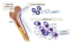 תמונה מספר 1: תאי מיאלומה שמוצאם מתא פלסמה בודד שעבר שינוי ממאיר, מתרבים במח העצם ומייצרים נוגדנים חד שבטיים המופרשים לזרם הדם